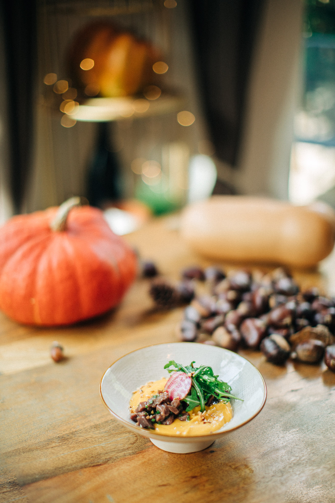 Crème de courge butternut – châtaignes, canard juste fumé et noisettes torréfiées